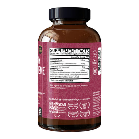 Raspberry ketone supplement is known for speeding up the process of weight management. 2 capsules per day of Nano Singapore's Raspberry supplement helps to supercharge metabolism and fat burning process. Raspberry Ketone has become popular ever since 2012